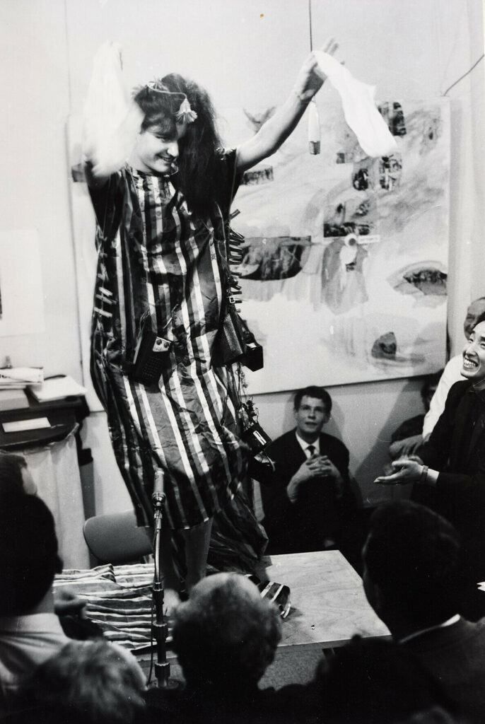 While some visitors remained in Kunsthandel Monet on that evening in October, Paik’s Moving Theatre continued as a tour on the streets of Amsterdam: he dragged a German army helmet on a chain (Dragging Suite), while audience members sang personal pronouns in their own languages. At one point Paik set fire to a violin with a radio attached and threw it into the water. The only participating Dutch artist was Willem de Ridder, organiser of subsequent Fluxus events in the Netherlands.