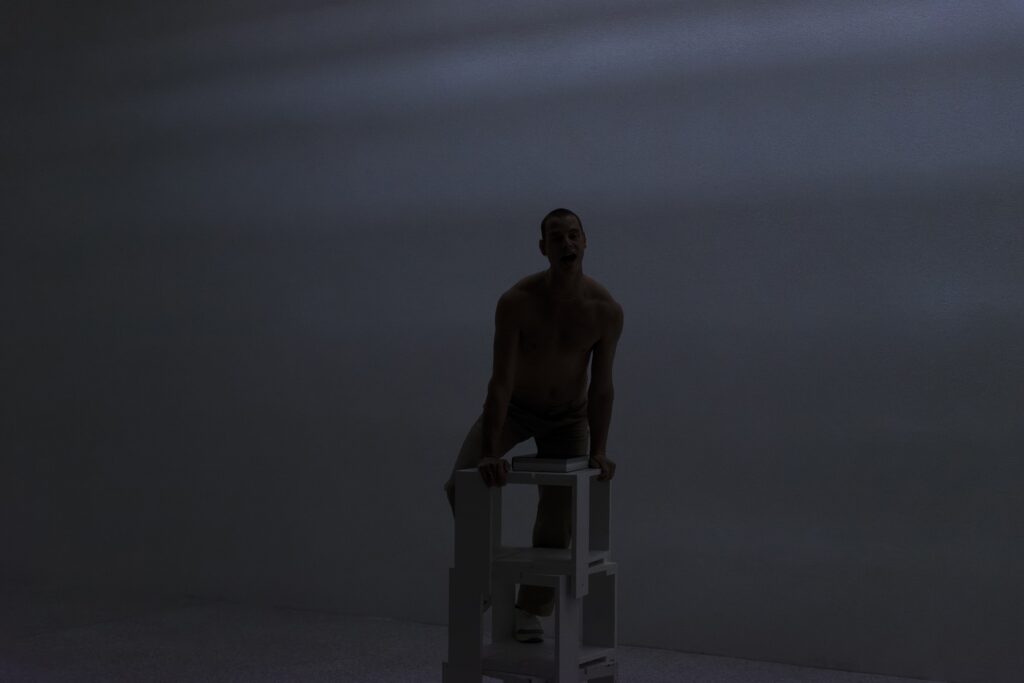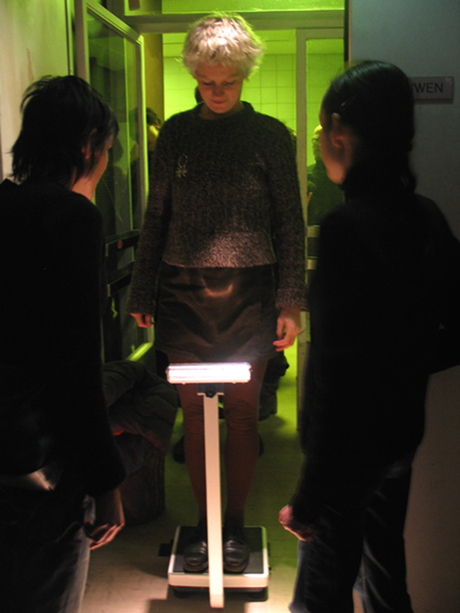 In 1996, when Marina Abramović had a major exhibition at the Groninger Museum, visitors had to sign a contract to attend a private-made film screening—even though they had already passed the “symbolic doorbell” of showing the entrance ticket. Around that time, and in the decade that followed, reenactments of performances started to gain traction. Younger performance artists often gravitated towards the more confrontational works from performance art history. One such piece took place at Post CS in Amsterdam in 2004. As I wrote at the time, the audience walked straight into a trap set by a well-known Dutch artist duo, L.A. Raeven.[iii] It reminded of Imponderabilia by Marina Abramović and Ulay. One by one, people allowed themselves to be weighed by two silent figures, the artists, unaware that a camera was projecting both the act and the revealing numbers of their weight onto twelve large white screens. Each person, who had just briefly been the exposed star of the show, left the playground by walking along a red carpet, while the artists applauded, and disappeared back into semi-darkness and became unavoidably the voyeur of the next victim. Light and darkness await Verhoeven’s performance participants too, though in quite a different atmosphere.